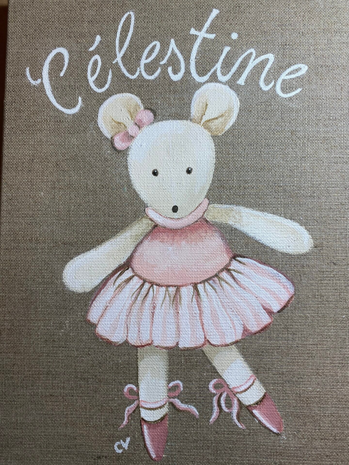 Ce tableau a été réalisé pour Célestine d’après la photo de son doudou préféré, qui est une petite souris rigolotte. Nul doute qu’il enchantera la petite fille, et constituera un merveilleux souvenir lorsqu’elle va grandir !