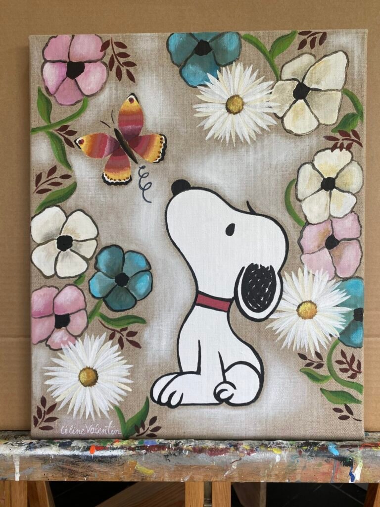 Snoopy, les fleurs et le papillon